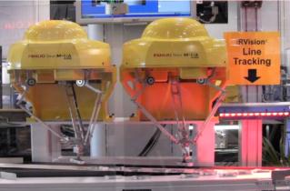 运用于食品医药行业的高速装盒作业则轮到大一号的拳头机器人M-2iA上场。两台M-2iA/3SL台机器人共用一个视觉相机及编码器数据,实现工件的高速装盒。M-2iA/3SL最大负载3KG,最大运动速度可达10000mm/s。配备最新的iRPick Tool功能,使用者能够方便地进行视觉跟踪功能的调试。