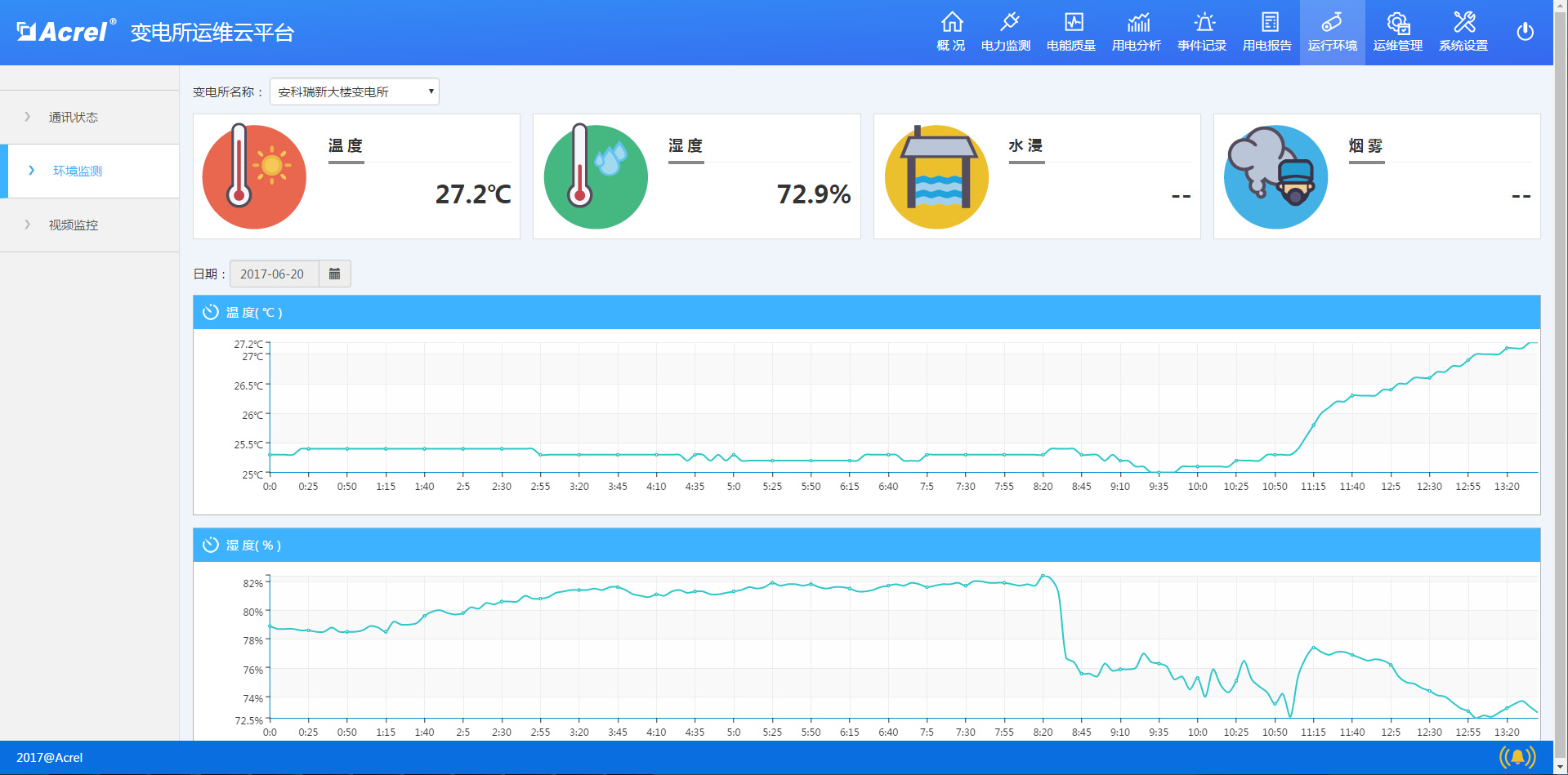显示某个变电所的仪表通讯状态、环境信息(温度、湿度、水浸、烟雾等)、视频信息等;