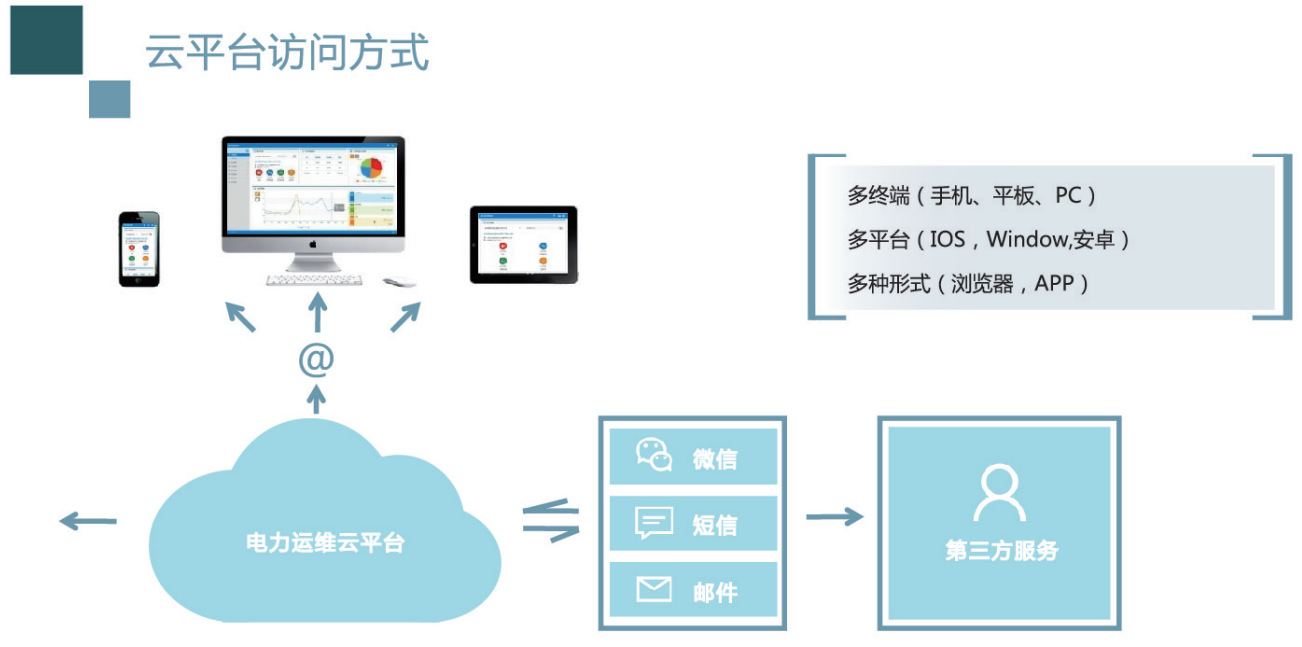 - 多种终端、多平台访问电力运维平台,以表格、图表、报表的形式可视化显示数据;