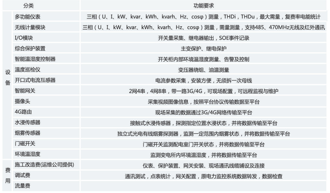 硬件包含与变电所改造有关的多功能电表、综合保护装置、无线测量模块、非电量传感器(烟雾、门禁、水晶、摄像头等)、网关,服务费根据变电所接入仪表的数量收取(例如某个变电所安装有仪表50个,每个仪表每年收取50元的服务费,则该变电所每年需交2500元的服务费),客户不需要再购买软件。