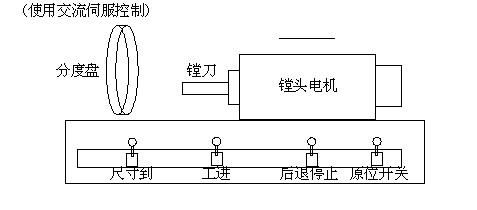 (2)镗头电机装在导轨上,由液压驱动,可以前进和后退,前进时没压到工进开关时,镗头前进时快速(镗头前进和镗头快速两个同时输出),当压到工进开关时,镗头速度为工进速度(镗头快速输出OFF),当工进压到尺寸到的开关,镗头停止进给,执行镗头后退,后退为快速(镗头后退和镗头快速同时输出)。