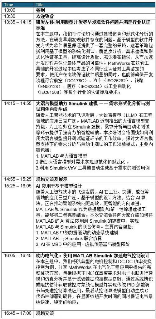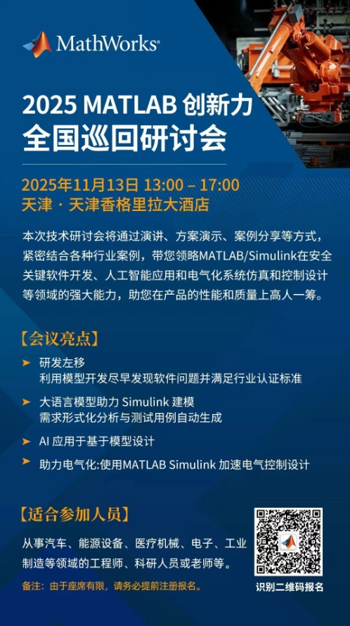 参加此次活动,您将了解 MathWorks 产品的最新技术进展,快速获得 MATLAB 和 Simulink 在相关领域中完整的工作流程和常用经典技巧,包括如何利用 MATLAB/Simulink 实现嵌入式软件系统化和完备化的测试,在研发早期发现 bug,同时符合高安全行业的认证要求;如何将大语言模型引入到基于模型设计的流程中,实现模型需求形式化分析和测试用例的自动化生成,提升测试验证的效率;如何在 MATLAB/Simulink 中将数据驱动和第一性原理建模完美结合,加速产品的智能化落地实现;最后,我们将深入探索 MATLAB/Simulink 近些年在电力电子与电机控制等电气化领域的持续投入,助力工程师缩短开发周期,并保障产品性能稳定。