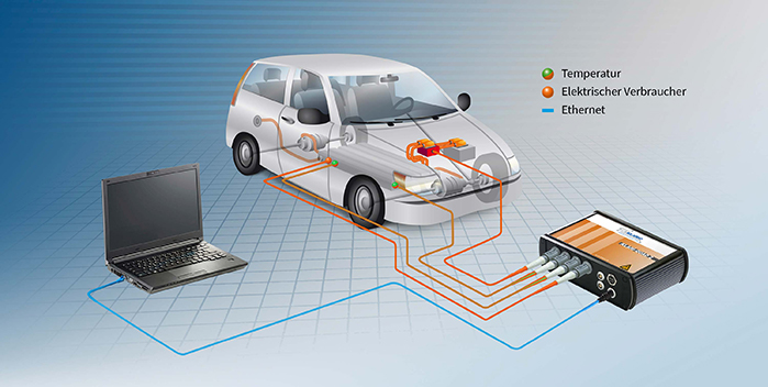意昂神州针对上述问题,根据自身多年新能源汽车领域的经验,通过整合国内国际资源,采用德国IMC公司研发的高性能数据采集系统,并结合意昂提供的测试服务,形成了一套系统的整车电性能测试解决方案。