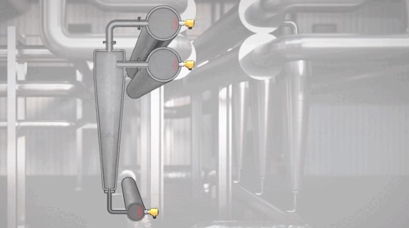 VEGA 的陶瓷压力变送器就安装在入料的分配罐上,用于监测入料压力。分配罐位于设备正中心,负责给周围的 6 个水力旋流器供料。因此,压力变送器的测量结果对水力旋流器的正常运行和分离效果起到了关键性的作用。