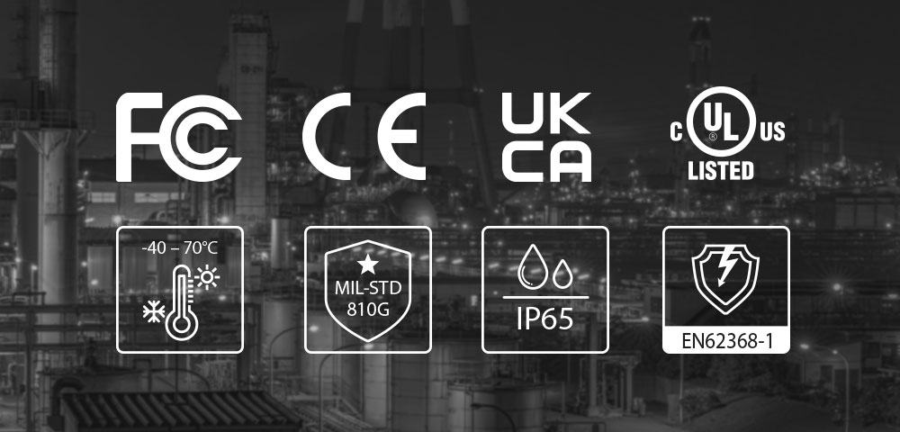 l 耐震动及冲击能力则是通过MIL-STD-810G/ IEC 60068-2-6、IEC60068-2-27等认证,确保产品能于运送、运作及储存过程中承受撞击后不受损。