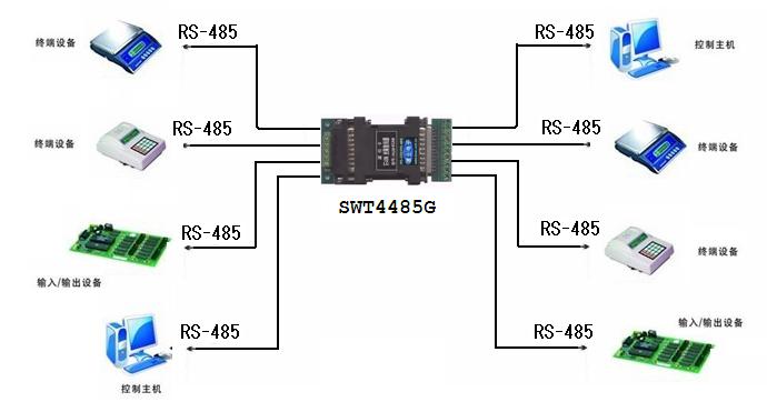 SWT4485G的每侧的4个RS485 口都可以接入RS485总线,就相当于是可以每一边开4个RS485的叉路。SWT4485G的各个上位机RS485 口(0、1、2、3 号)功能是完全一样的、可以互换;同理,SWT4485G的各个下位机RS485 口(4、5、6、7 号)功能是完全一样的、也可以互换。使用SWT4485G组网后,无需修改软件也无需设置,也不影响其它节点的正常通信!注意每一条RS485支线都需要支线两端接终端电阻,