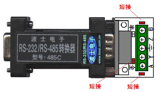 波仕485C是一种RS-232到RS-485/422的无源转换器,全双工半双工通用。将485C的端子板的跳线设置为全双工,并且跳线将A-Y短接、B-Z短接即可。