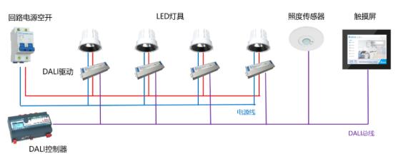 DALI智能照明可实现每盏灯具的调光,同时可以实现任意组合区域的灯具控制,后期可以自由组合回路,不需要更改现场硬件。向上可通过OPC、BACnet/IP、LON-IP852等网络协议直接接入上层监控网络或者第三方平台实现整合。采用这种方式可使得照明控制架构更为简洁,且数字信号不易受干扰,DALI信号不分极性,可以与强电共管,施工布线更加方便。