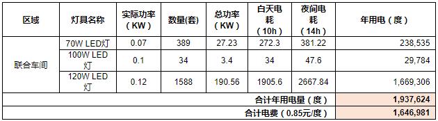经过计算,现场能耗使用大大降低,以一个车间为例,现场使用的灯具参数如表2所示。
