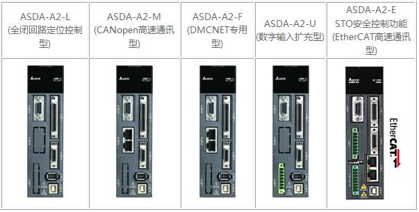 站号配置可由韧体功能设定 使用标准网络通讯线材,线材长度最长可达40米 最多可支持127轴的高速通讯连接 ASDA-A2-U 特色: 提供14点的DI数字输入讯号点数。 搭配NC 控制器、中大型PLC的命令控制,可实现复杂的过程控制。 快速接头方便客户在配在线能够简单使用。 内置DC 24V省去外接电源的繁琐。 ASDA-A2-E 特色: 可藉由CN7中两个专属DI或外接编码器来实现高速位置抓取功能 内置STO,符合EN 61800-5-2 ; IEC 61508(SIL2) ; IEC 62061(SIL2) ; ISO 13849-1(Cat.3 ,PL=d) 支持220V及400V,机种广泛 支持全闭循环控制 支持绝对型及增量型ECMA系列马达 产品规格 ASDA-A2系列共有五个机种:ASDA-A2-L, ASDA-A2-M, ASDA-A2-F, ASDA-A2-U, ASDA-A2-E