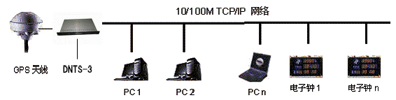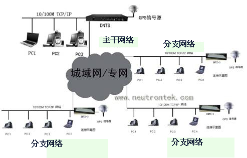 中新创科的DNTS时间服务器是GPS时间同步技术和互联网时间同步技术的结合。采用19英寸1U机架式设计,内置GPS接收机,以GPS卫星时间为标准时间源,支持NTP协议(V2.0/V3.0/V4.0)和SNTP协议。能够为局域网内成百上千的计算机、路由器等提供时间校准。下图1为网络时间服务器的应用方案: