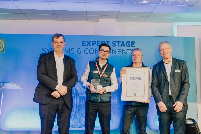德国农业协会主席Hubertus Paetow(左)与系统与零部件奖评审团主席Till Meinel教授(右)共同为igus农业工程部门经理André Schönhaar(中左)和重载型产品经理Uwe Sund(中右)颁奖。(来源:DLG)
