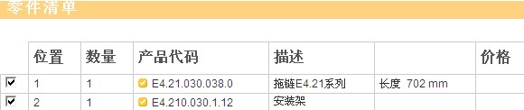 您可在此设定您个人的拖链系统。所有条目及零部件都位于页面底部的零件清单内。