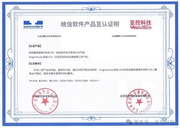 经过双方一系列全面严谨的认证测试后,双方认定亚控科技KingHistorianV4.0信创版与统信软件技术有限公司的统信服务器操作系统V20完成兼容性测试,能够达到通用兼容性要求及可靠、稳定、高性能运行要求,满足用户的关键性应用需求。