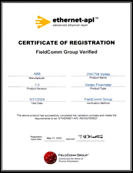 经过一系列全面的试验后,国际标准化组织FieldComm Group授予ABB涡街流量计(VortexMaster FSV400)和旋进流量计(SwirlMaster FSS400)全球首张Ethernet-APL标准认证。涡街和旋进流量计是在过程工业中使用较广泛的流量计,通过Ethernet-APL技术赋能,ABB将带有以太网通讯的涡街和旋进流量计带入到工业环境中危险区域。