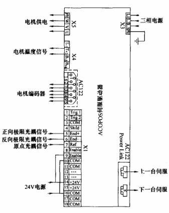 图3 给出了一台电机的伺服控制器与共他硬件设备的连接图。电机控制器采用了B&R ACOPOS 伺服控制器。伺服控制器插人了Power Link 模块AC112 ,用于和前后两台伺服控制器相连;AC122 为旋转编码器模块,用于电机的速度与位置检测。ACOPOS 1090 本身提供了温度信号检