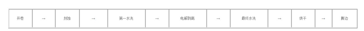 开卷 → 刻蚀 → 第一水洗 → 电解剥离 → 最终水洗 → 烘干 → 撕边
