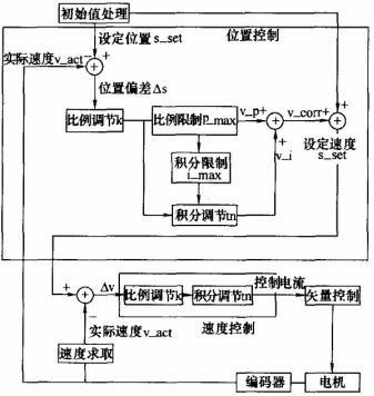 ACOPOS 的伺服控制如图4 所示,大致可以分为四个部分:初始值处理、位置控制、速度控制、实际值检测。在初始处理时,根据给定的位置及最大允许速度和最大允许加速度,给出一个理想的定位过程,即得出加速、恒速、减速段,不同位置时的速度也相应得到。位置控制主要有比例调节、比例调节限制p _ max 、积分限制i _ max 和积分调节。比例调节后的值为k* △s ,若k* △s > p _ max ,则v_ p ﹦P _ max ;若k* △s ﹤﹣p _ max ,则v _ P = ﹣p _max 。同理i _max 用干限制积分调节值,v _i 。速度调节为一般的PI调节得到控制电流值送入矢量控制器,对电机进行控制。而电机的实际位置通过编码器得到。