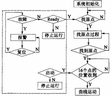 找原点时,电机统一向正向运行,若收到原点信号就停下,定为O 位;若收到正向极限信号就停下然后反方向运行,找到原点信号,定为0位。曲线运动为一个子程序,点与点之间做匀加速运动,通过位置的判断,对虚轴进行加速度的切换。