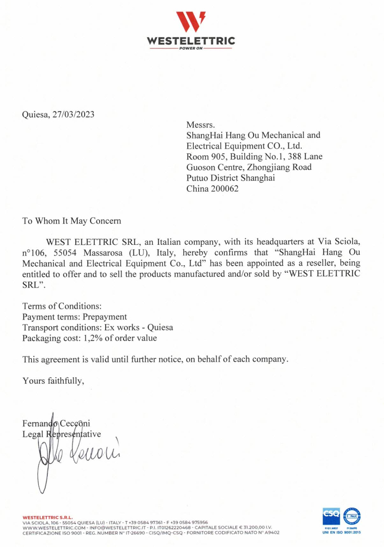 · 授权信息:为WESTELETTRIC工厂授权的2023年度中国区代理。
