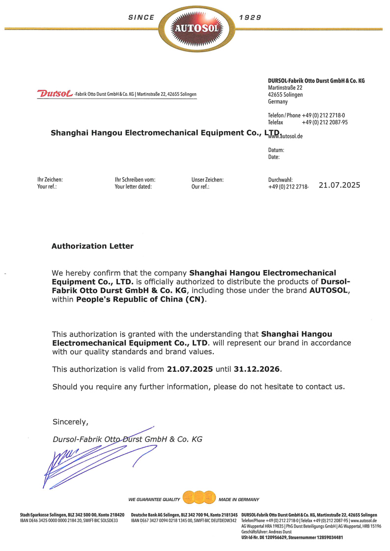 2025年,德国AUTOSOL工厂正式授权上海航欧为其中国区代理