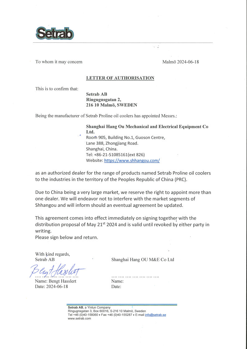 自2024年起,上海航欧机电设备有限公司正式成为瑞典SETRAB工厂中国区授权代理商,专业提供全系列SETRAB冷却器、换热器、散热器及机油冷却器产品。依托稳定的国际供应链与多年行业经验,我们在价格与货期方面具备竞争优势。