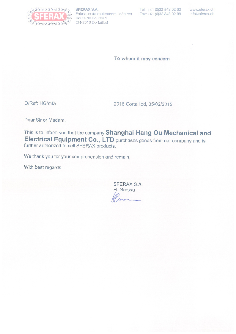 自2015年起,上海航欧机电设备有限公司正式成为SFERAX品牌中国区授权销售代理,专业提供全系列SFERAX直线运动轴承及配件。公司依托稳定的进口供应渠道与多年行业经验,在价格与货期方面具备竞争优势。