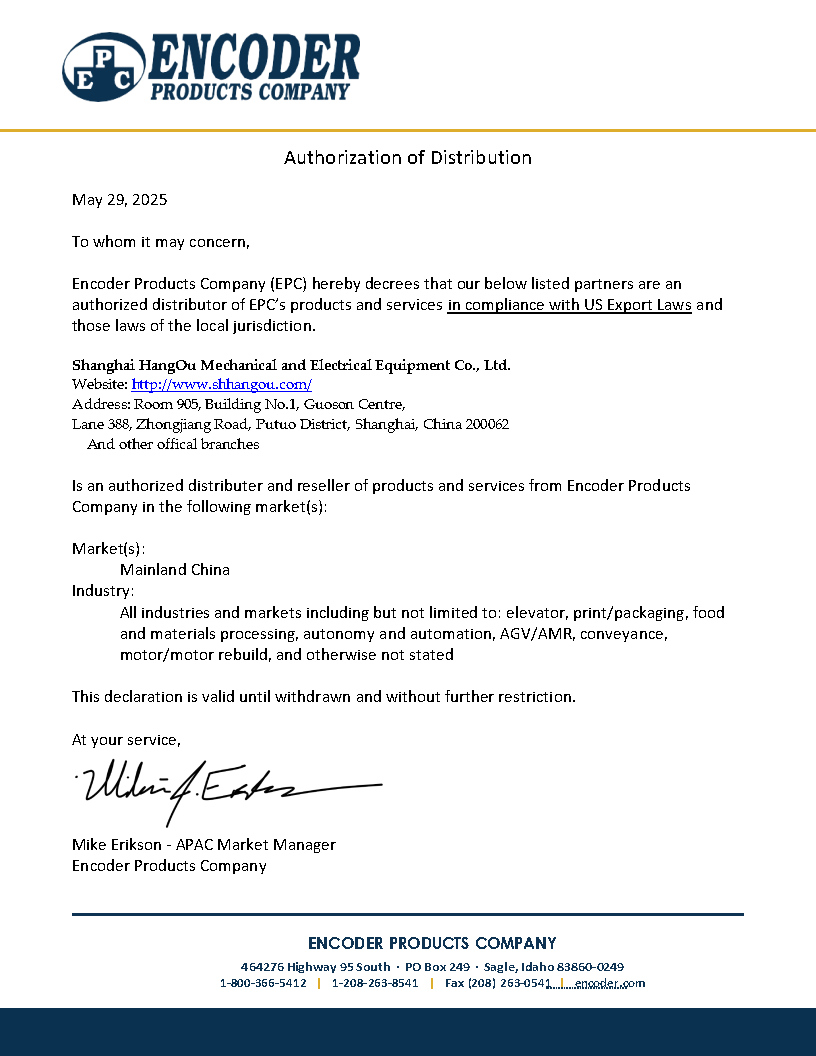2025年,美国ENCODER工厂正式授权上海航欧机电设备有限公司成为BRITISH编码器在中国区的代理商。