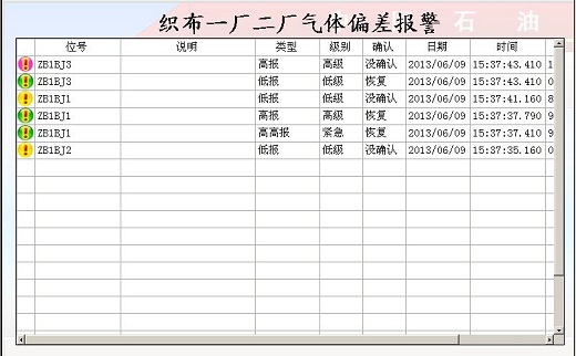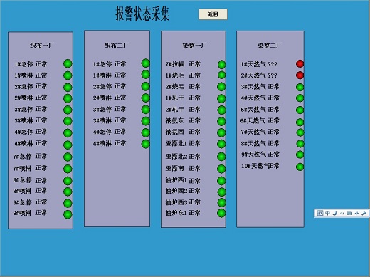 该项目企业是某外商投资股份制集团下属的纺织子公司,拥有纺纱、漂染、织布、整理、制衣等十七个生产工厂,现阶段染色、织布、漂白、烧毛等车间已有五十余台独立设备可以独立的进行气体,液位等报警。这些报警数据原来每天只能由车间工人实时查看,出现报警时需现场确认。采用紫金桥软件后将全厂所有报警信息汇总到服务器PC。
