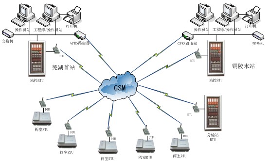 整个工程首末站控系统及繁昌分输站采用安控科技的Super32 RTU实现现场工艺参数的监控,所有阀室均采用安控科技低功耗RTU产品Super32一体化 RTU实现现场工艺的监控。芜湖首站、铜陵末站设操作站1套、工程师/操作员站1套,系统结构图如下: