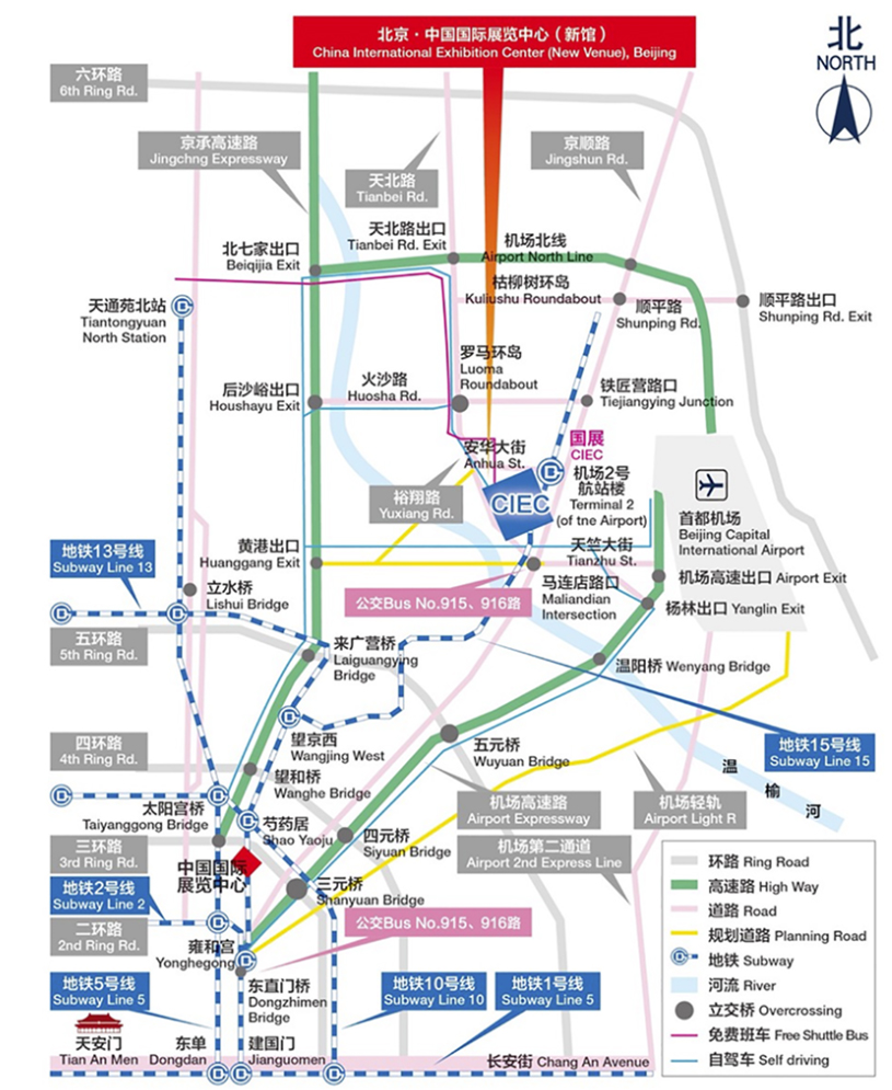 行驶路线可选择京承高速路线(后沙峪出口)、机场高速路线(杨林出口)、京密路行驶至中国国际展览中心(顺义馆)及首都国际会展中心。