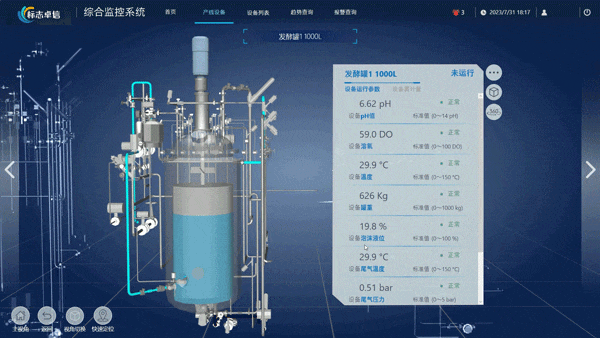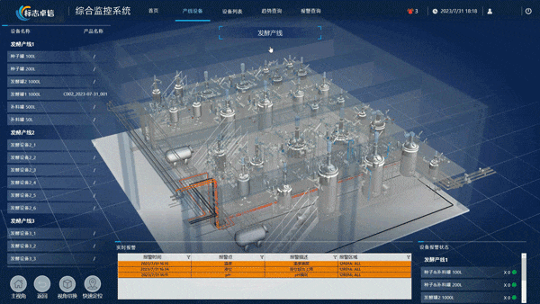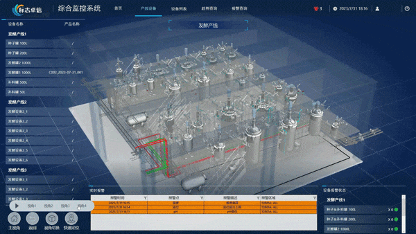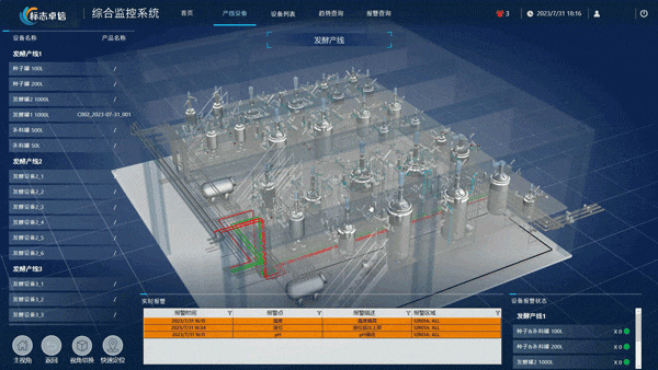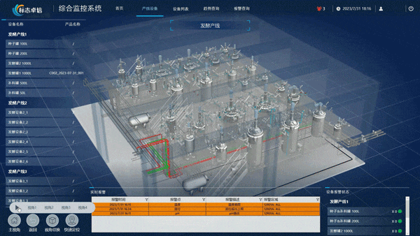 标志卓信基于生物医药企业整体工艺流程,将种子罐、发酵罐、补料罐、发酵设备等工艺流程,通过三维场景一次性展示,并依次展示各个工艺流程运作,可直观的掌握整个发酵产线运作概况及流程。可以进行视角轮训展示。