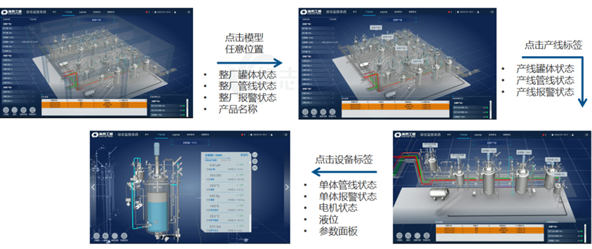 标志卓信利用三维模型的高交互性呈现设备状态和工艺流程,进行药物产品设计和优化。整体产线模型按照产线划分、再把产线按照设备划分实现点击按照“整厂-产线-设备”的方式逐步加载的操作逻辑。可在不同层级视角查看不同层级的信息。