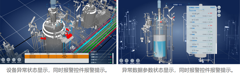 通过3D动画展示药品生产流程,便于监控和管理生产过程。监测搅拌状态和转速并模拟搅拌对泡沫液位高度的影响。监测设备启停状态,模拟介质对应管线从主管到罐体再到出罐的路径状态。并根据介质不同进行模拟介质通过不同路径入罐或出罐情况。