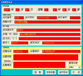 当电脑接警中心所管辖的区域内的设备发生报警时,由防盗报警装置检测到报警,并将报警内容发送给接警中心,接警中心软件即启动接警程序,将报警信息接受。