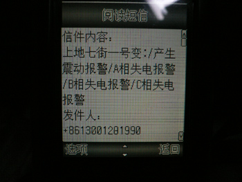 手机接警中心以管理人员的手机为载体,接收变压器防盗报警装置上报的各类报警信息,这种方式的优点是对手机要求不高,只要能够正常显示中文信息的手机就可以使用,这样可以有效节约投资;同时,手机作为管理人员日常携带的通讯设备,一般都会随身携带,这样,无论管理人员身在何方,只要开机就可以收到变压器防盗报警装置的报警信息,保证了报警信息的有效传达。手机接警中心的不利方面是只能被动的接受信息,由于手机的操作不如电脑方便快捷,所以无法完成电脑接警中心的对于设备的日常管理功能。