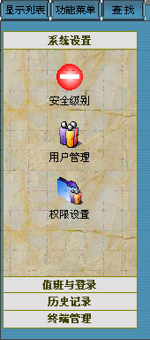 点击“系统设置按纽”,可分别进入“安全级别”、“用户管理”、“权限设置”。