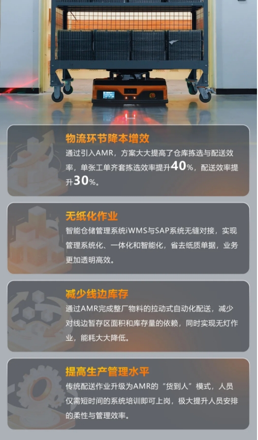 基于对现场的实地调研,项目引入了箱号管理体系,有效提升了仓储管理的精细度,并打造从收货、质检、上架,到高频生产拉动、半成品出入库及成品下线全流程的智能物流方案,实现高品质、低成本、柔性化的智能制造体系。