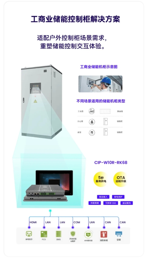 工商业储能系统包含 EMS 系统、PCS、电池簇、消防、温控系统,其中 EMS 系统用于监测、控制和管理储能系统,需要配置工业平板电脑连接多类传感器持续通讯,保障电池组能量调度、状态监测、评估等数据的实时传输,灵敏的触控屏幕,被动散热系统,SPES TECH 源控提供 CIP-W10R-RK68 工业平板电脑作为工商业储能控制柜专用机。