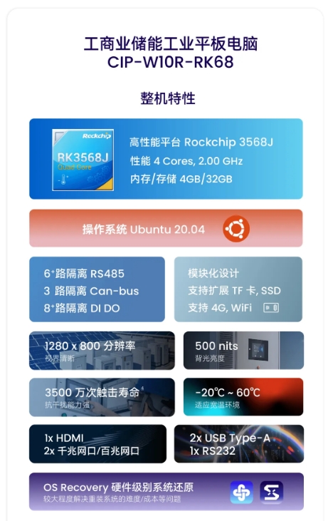 搭载瑞芯微 Rockchip 3568J 高性能处理器平台3,4 核,2.00 GHz,支持 1T 算力,内存/存储 4GB+32GB,搭载 Ubantu 20.04 操作系统,1x HDMI,2x 千兆网口/百兆网口,2x USB Type-A,1x RS232,支持 TF 扩展,支持 4G 与 WiFi,实时连接 EMS 系统、PCS、电池簇和其他安全系统,确保运维操作与远程管理的高效协同。