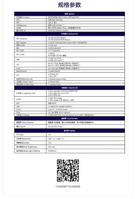 触控屏方面,10.1 英寸,1280 x 800 分辨率,500 nits 背光亮度,默认支持电容触控,板卡预留电阻触摸设计,3500 万次触击寿命4,为色彩显示和精准触控做好硬件基础设计。