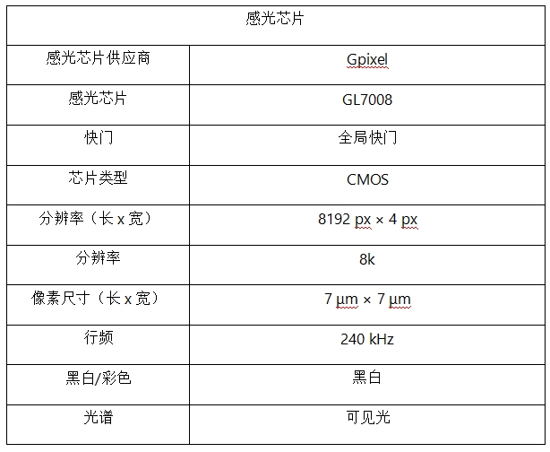 •   Basler r2L8192-240cm CXP相机搭载GPixel GL7008 CMOS系列芯片,可在8k分辨率下提供240 kHz的扫描行频。