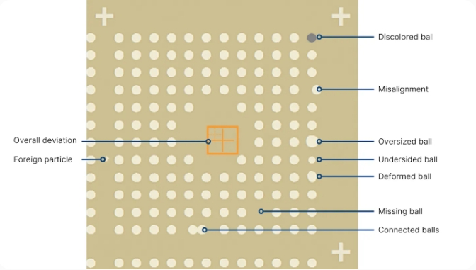 BGA检测在封装前验证焊球质量与阵列完整性,确保尺寸均匀、球体圆整及布局精准。