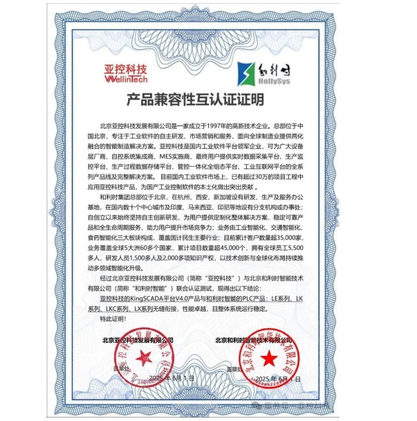 经过双方一系列全面严谨的认证测试后,双方认定亚控科技KingSCADA平台4.0软件与和利时智能的PLC产品:LE系列、LK系列、LKC系列、LX系列产品,完成兼容性测试,能够达到通用兼容性要求及可靠、稳定、高性能运行要求,满足用户的关键性应用需求。