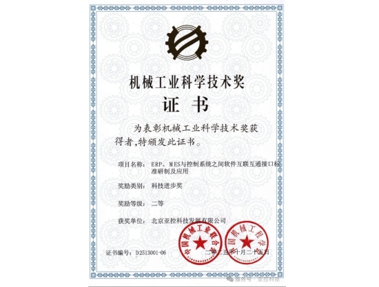 •   近日,亚控科技参编的“ERP、MES与控制系统之间软件互联互通接口标准研制及应用”系列国家标准,成功荣获2025年度机械工业科学技术奖二等奖!此次获奖,是行业对亚控科技在工业软件互联互通领域技术深耕与创新实力的权威认可,标志着亚控科技在打破工业系统信息壁垒、推动产业数字化协同方面取得关键突破!