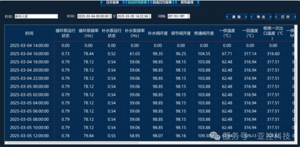 数据管理子系统支持自定义查询时间段、机组及时间间隔,以报表形式展示隔压站、大温差机组的运行参数。报表涵盖循环泵频率、供回水温、阀门开度等关键数据,支持导出与打印,为运维复盘、能耗分析及调度优化提供直观数据支持。