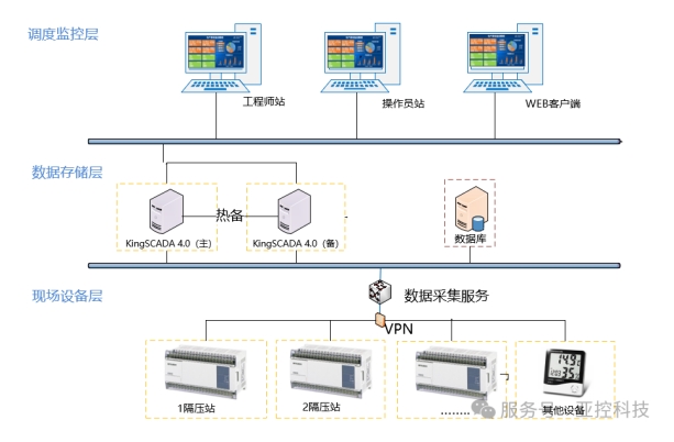 KingSCADA4.0信创监控系统整体架构分为调度监控层、数据存储层与现场设备层,其核心功能涵盖驾驶舱监控、设备运行监管、报警管理、趋势分析及数据报表,实现隔压站运行的实时监控、综合分析与高效管控,全面提升管理效率与运营效益。