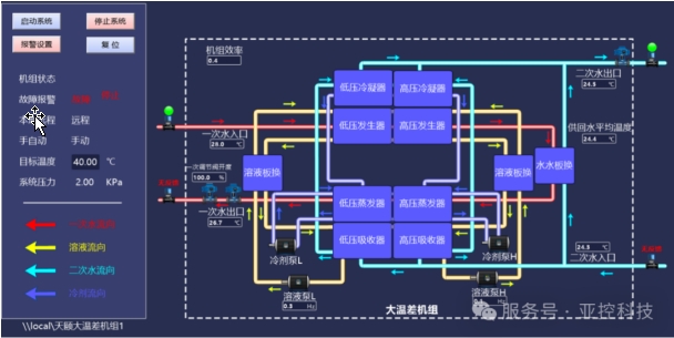 大温差机组监控子系统针对大温差机组设计专属监控界面,实时呈现机组效率、供回水平均温度、系统压力等关键数据。管理员可远程切换“本地/远程”控制模式,实现机组启停、故障复位等操作,同时实时监测高压发生器、冷凝器、溶液泵等核心部件状态,异常情况即时预警。