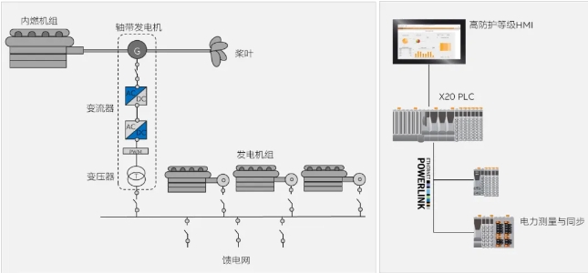 图5是贝加莱在船舶领域的典型应用场景,轴发系统控制。X20PLC的CM0985模块是一个针对能源监测的专用模块,它能够对发电机组的电力信号进行高精度采样。X20PLC则能够基于高级语言为机组控制提供算法设计、逻辑控制、过程监测、报警、日志的能力。