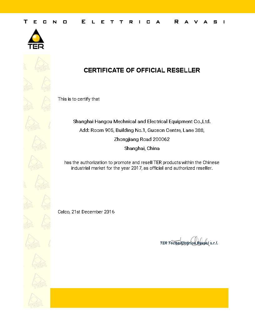 自2016年起,上海航欧正式成为意大利TER(Tecno Elettrica Ravasi)品牌的中国区授权销售合作伙伴。